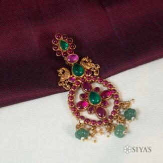 The Peacock Red Stone Pendant is a stunning piece of jewellery that combines elegance with artistic expression. The intricate detailing of the peacock design is complemented by the vibrant red stone, which serves as the focal point of the piece.